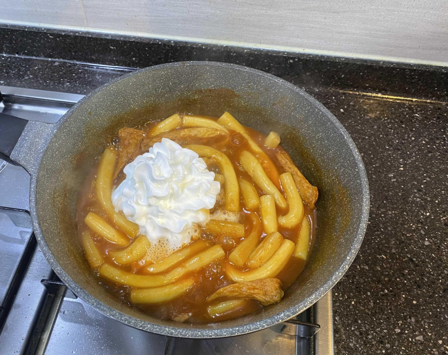 평소랑 다름 없는 양념으로 하고 라면스프랑 코스트코 스프레이생크림을 추가해서 만들었어요.