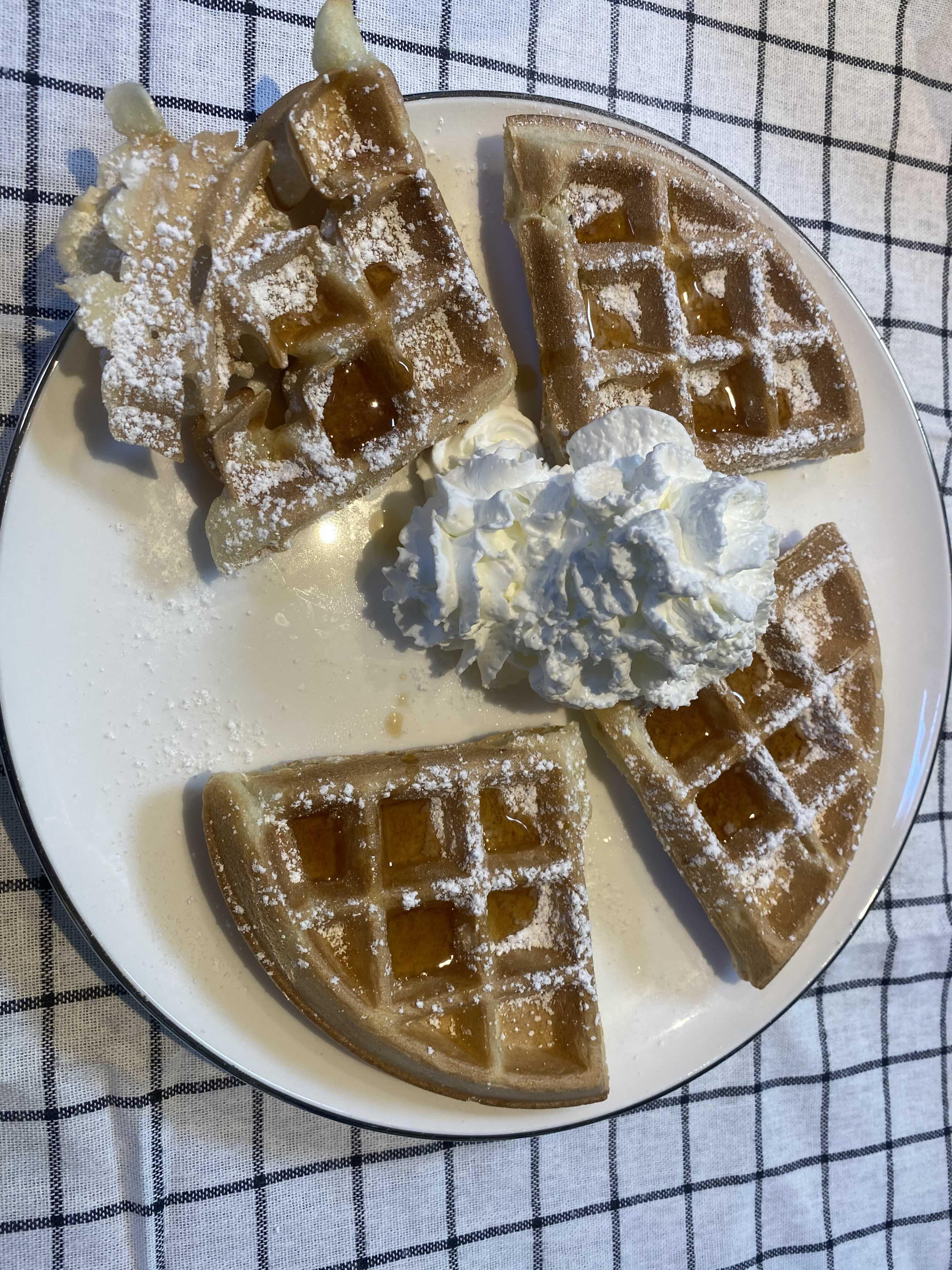 아침에 아이들이 와플에 생크림을 올려달라고 해서 학교가기 전에 두조각씩 먹고 출근했어요^^