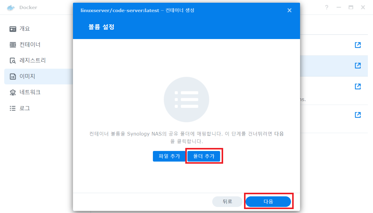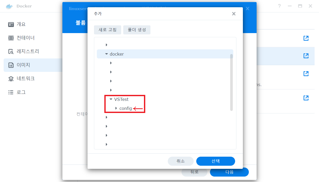 폴더추가하기 전에 Docker에 폴더를 먼저 생성을 해줘야된다. 일단 폴더부터 생성하자