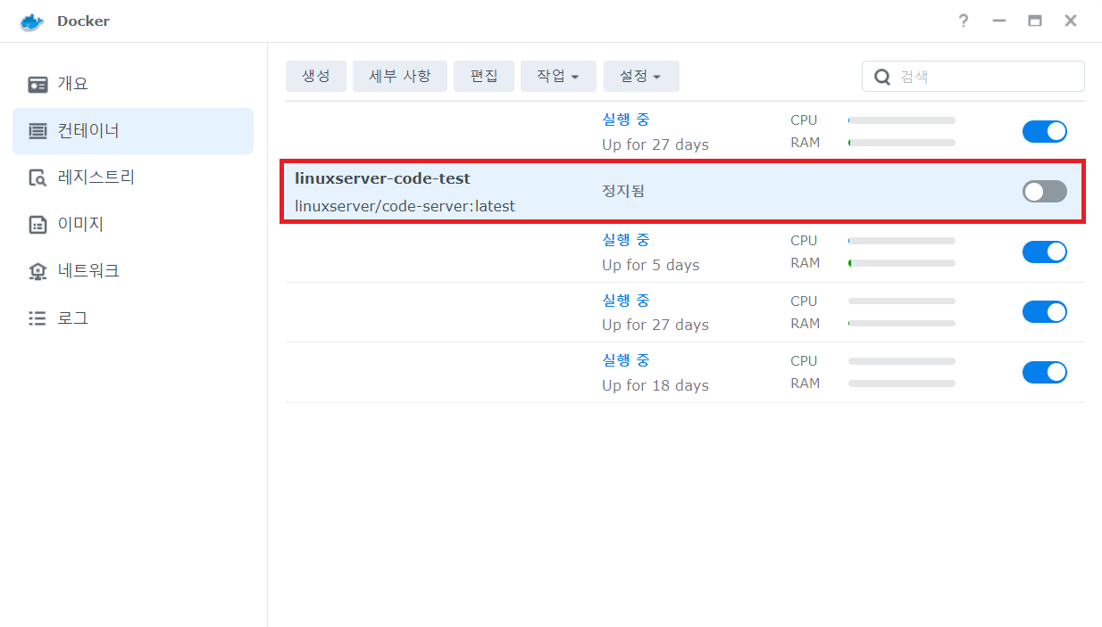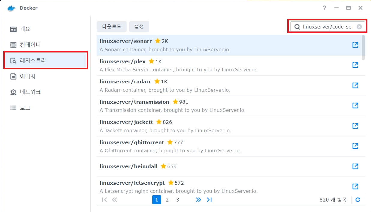 자 이제 레지스트리(클릭) -> 검색창에 linuxserver/code-server 를 검색해본다. 검색하면 code-server가 나올 것이다.