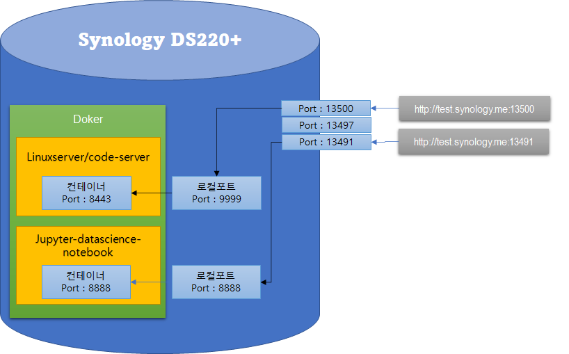 자이제 구동을 시켜보겠다 [사용자ID].synology.me:[내가지정한포트]