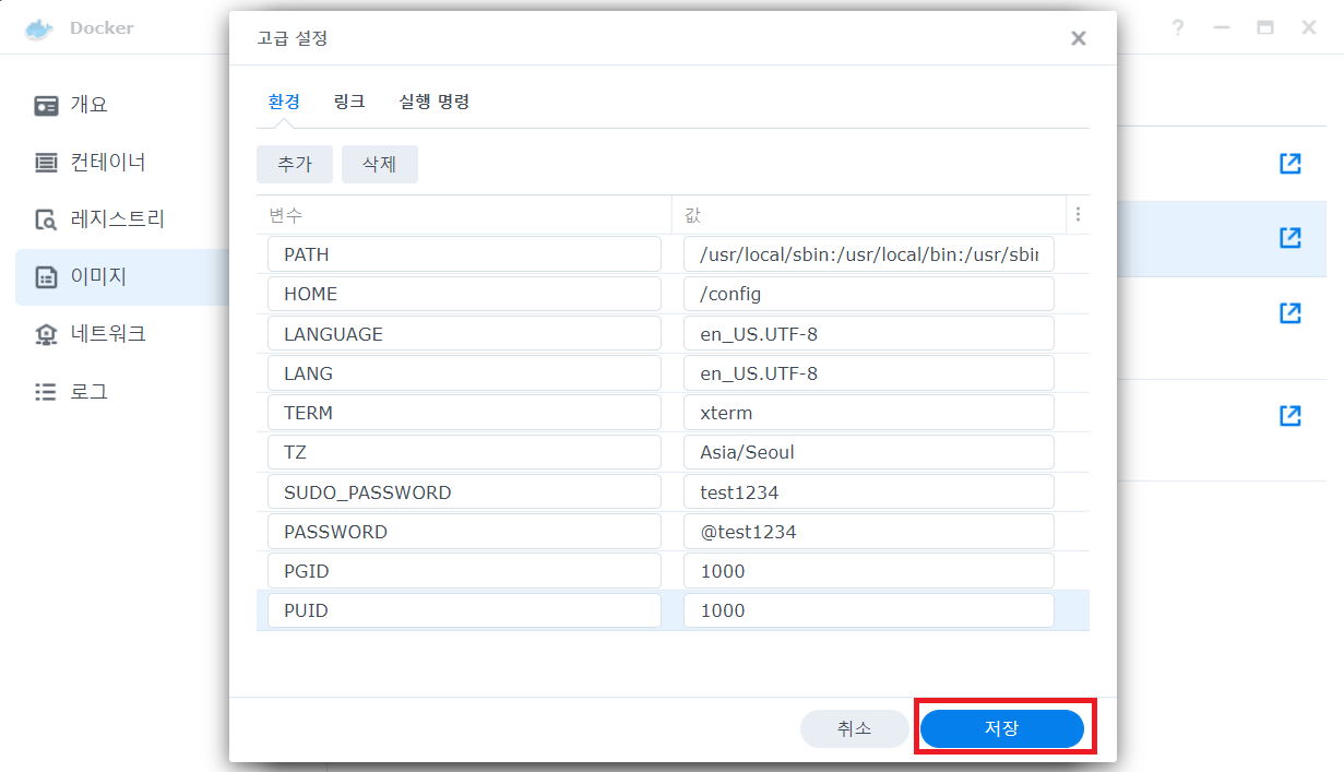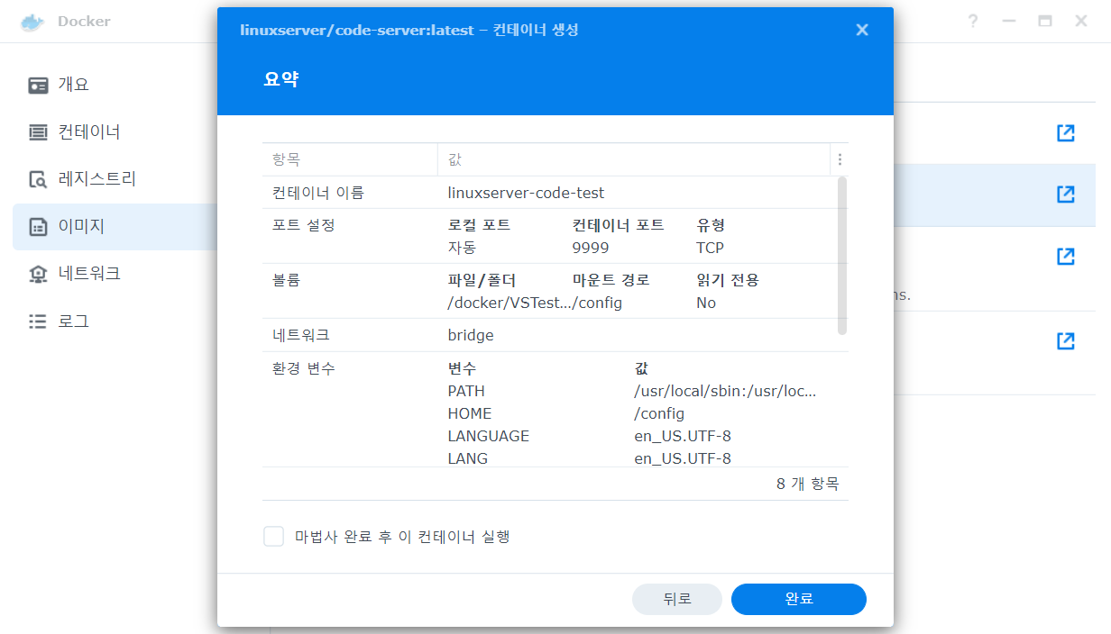 일반설정에서는 컨테이너 이름을 입력 나는 "linuxserver-code-test" 정했다.