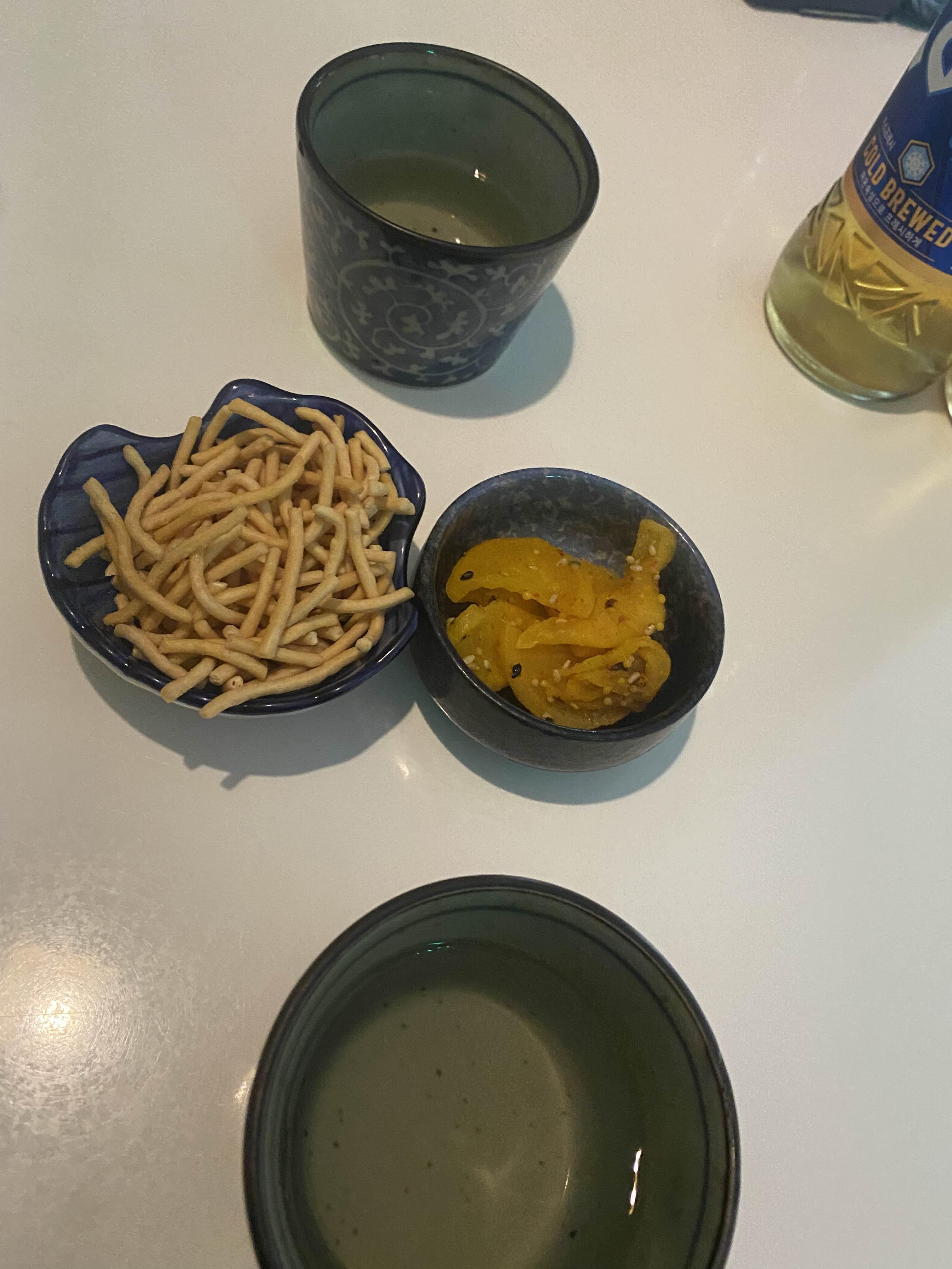 안주는 퓨전답게 과자 부시래기와 단무지가