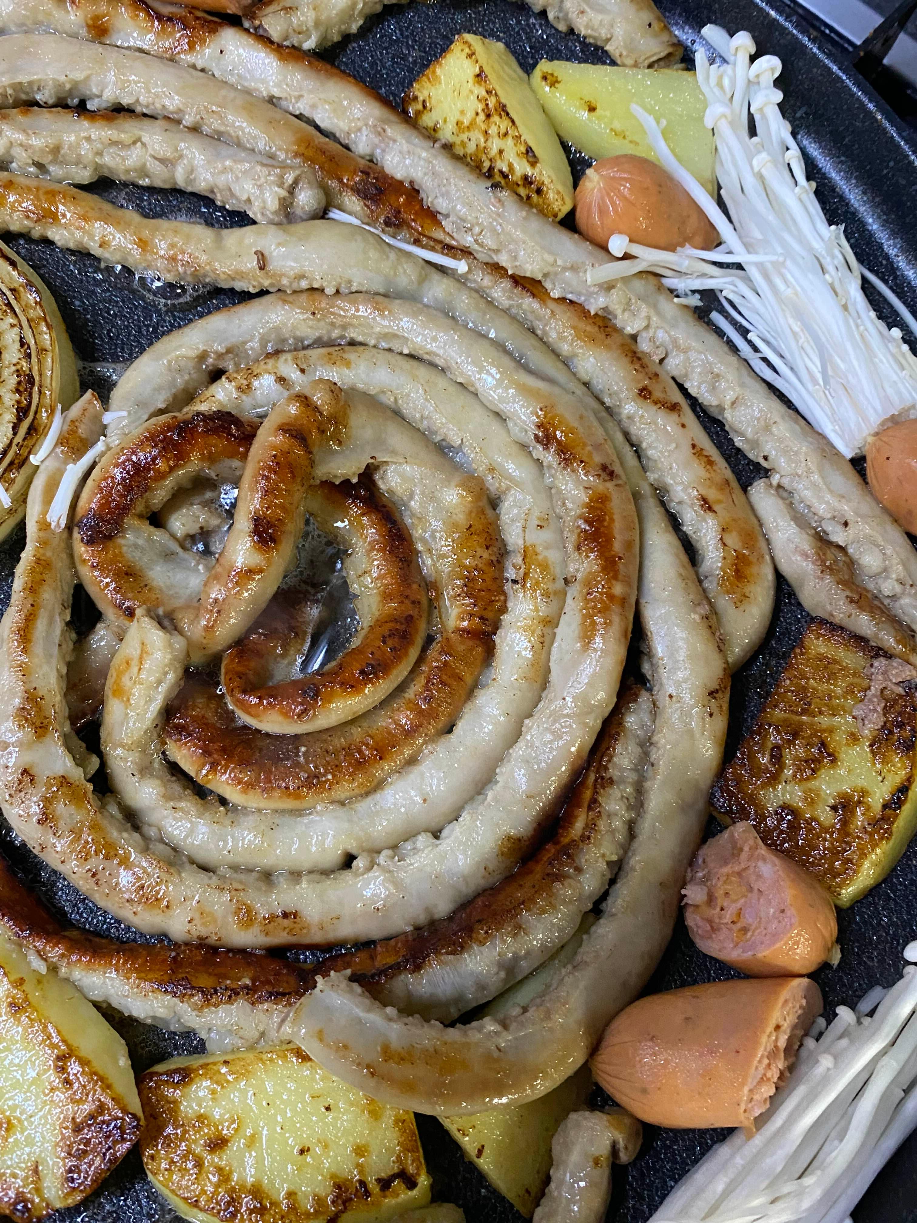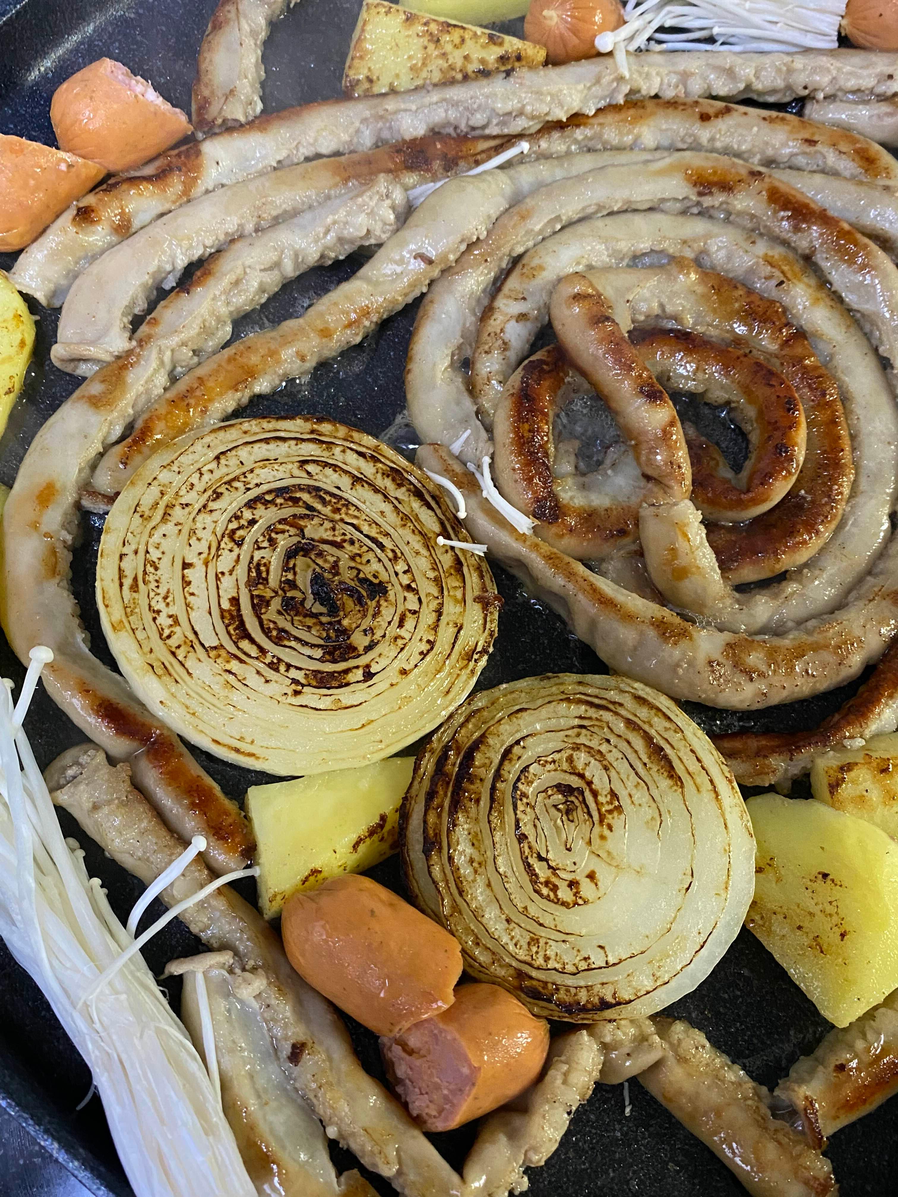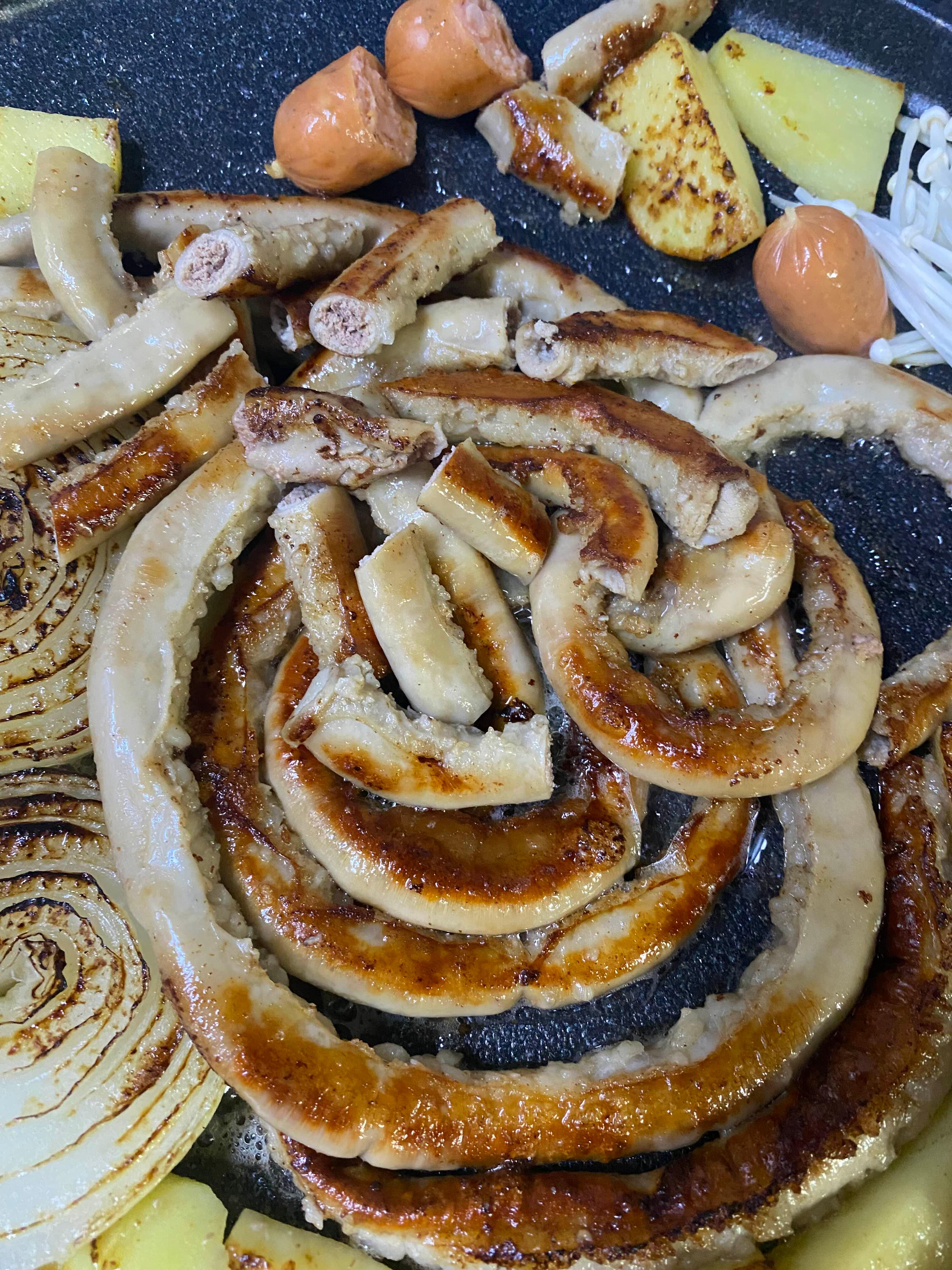 • 프라이팬을 중약불로 예열한 후 곱창을 뱅글뱅글 둘러 구워주세요.