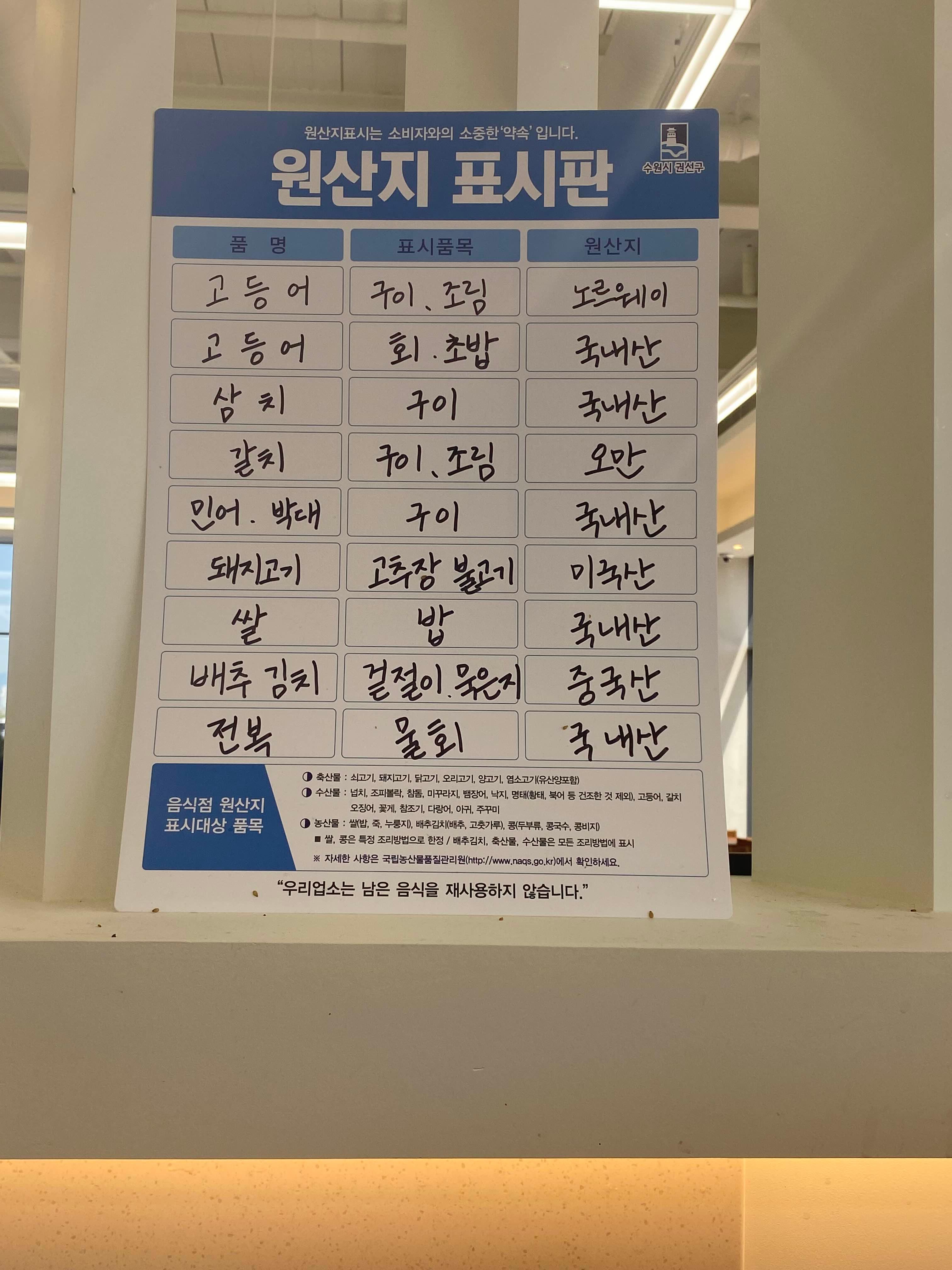 음식이 되는 재료의 원산지를 눈에 띄는곳에 남겨 두었답니다.
