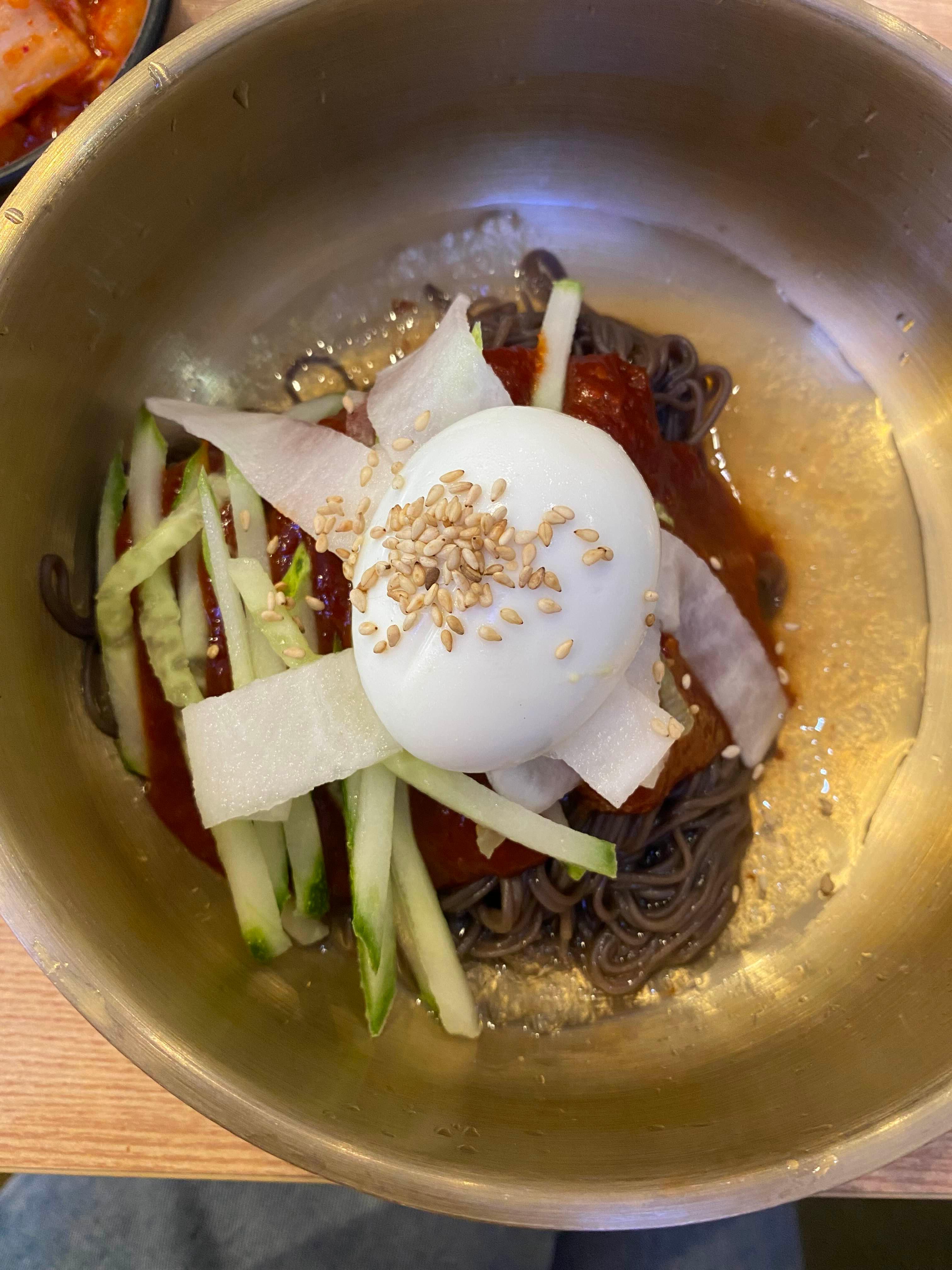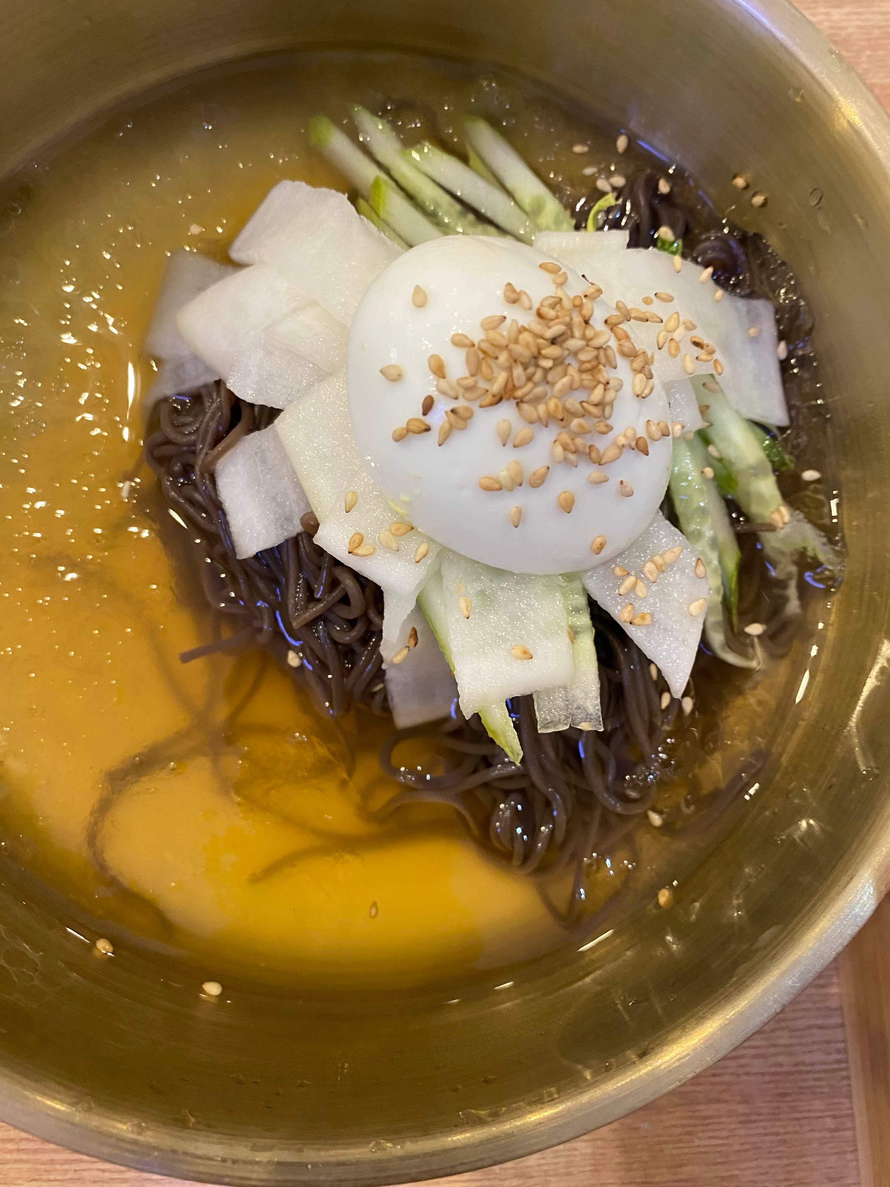 • 맛 표현: 맑고 시원한 육수에 쫄깃한 면발과 오이·편육·계란이 올려진 단정한 비주얼.