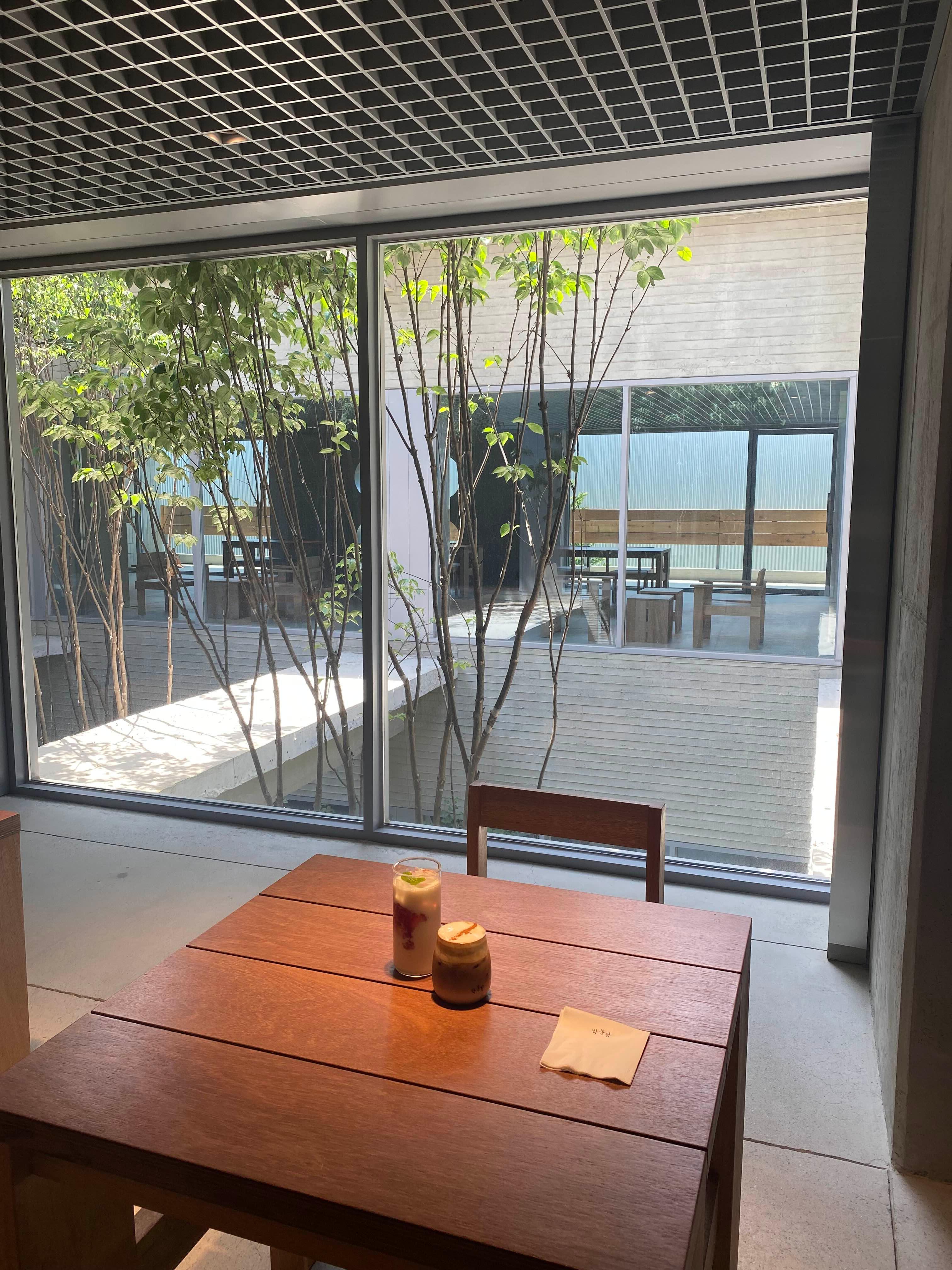• 2층: 따뜻한 우드톤 인테리어의 테이스팅룸과 카페 좌석, 중정 뷰