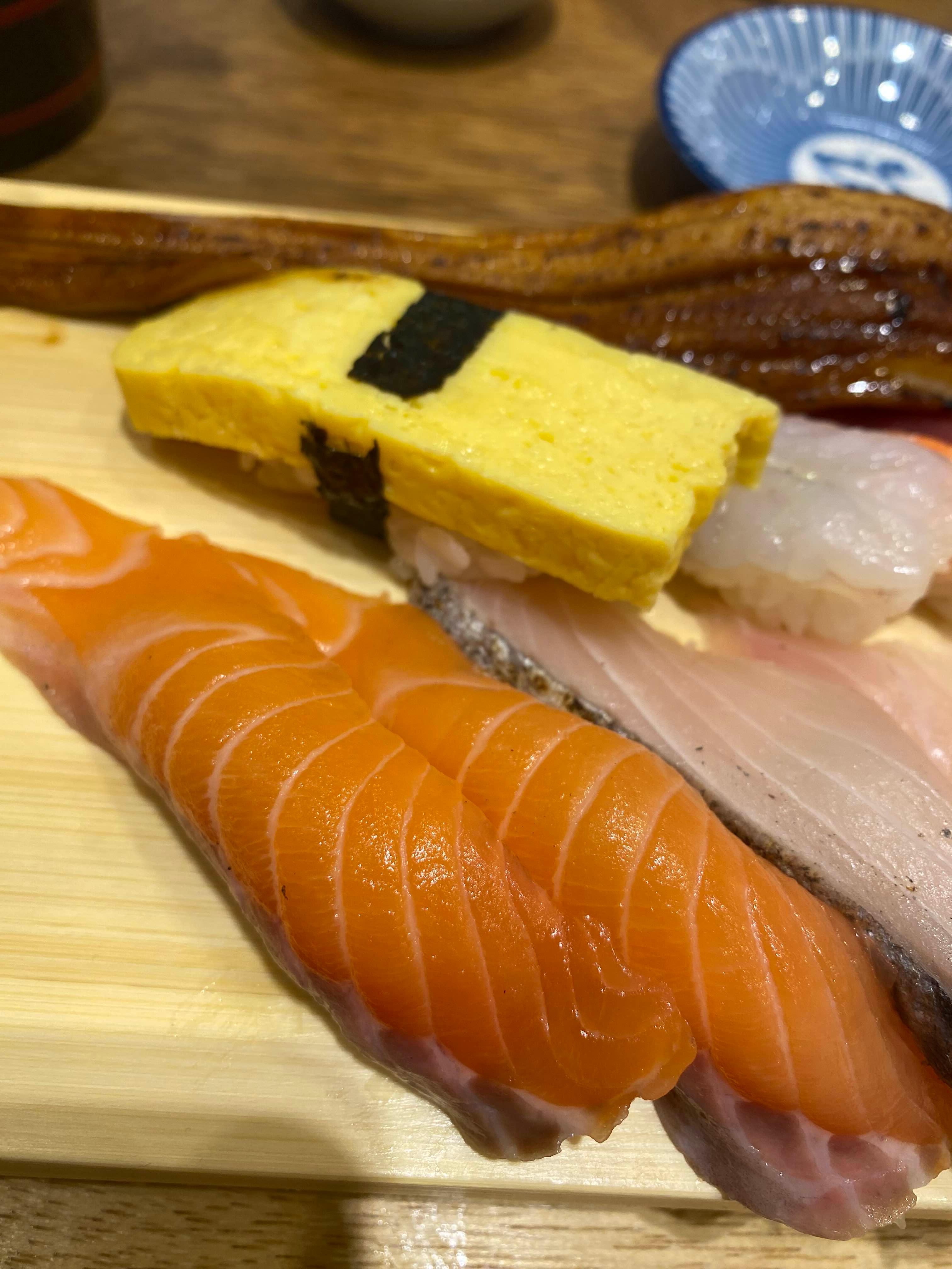 연어의 부드러운 풍미, 새우나 흰살 생선의 담백함, 달걀 초밥의 은은한 단맛이