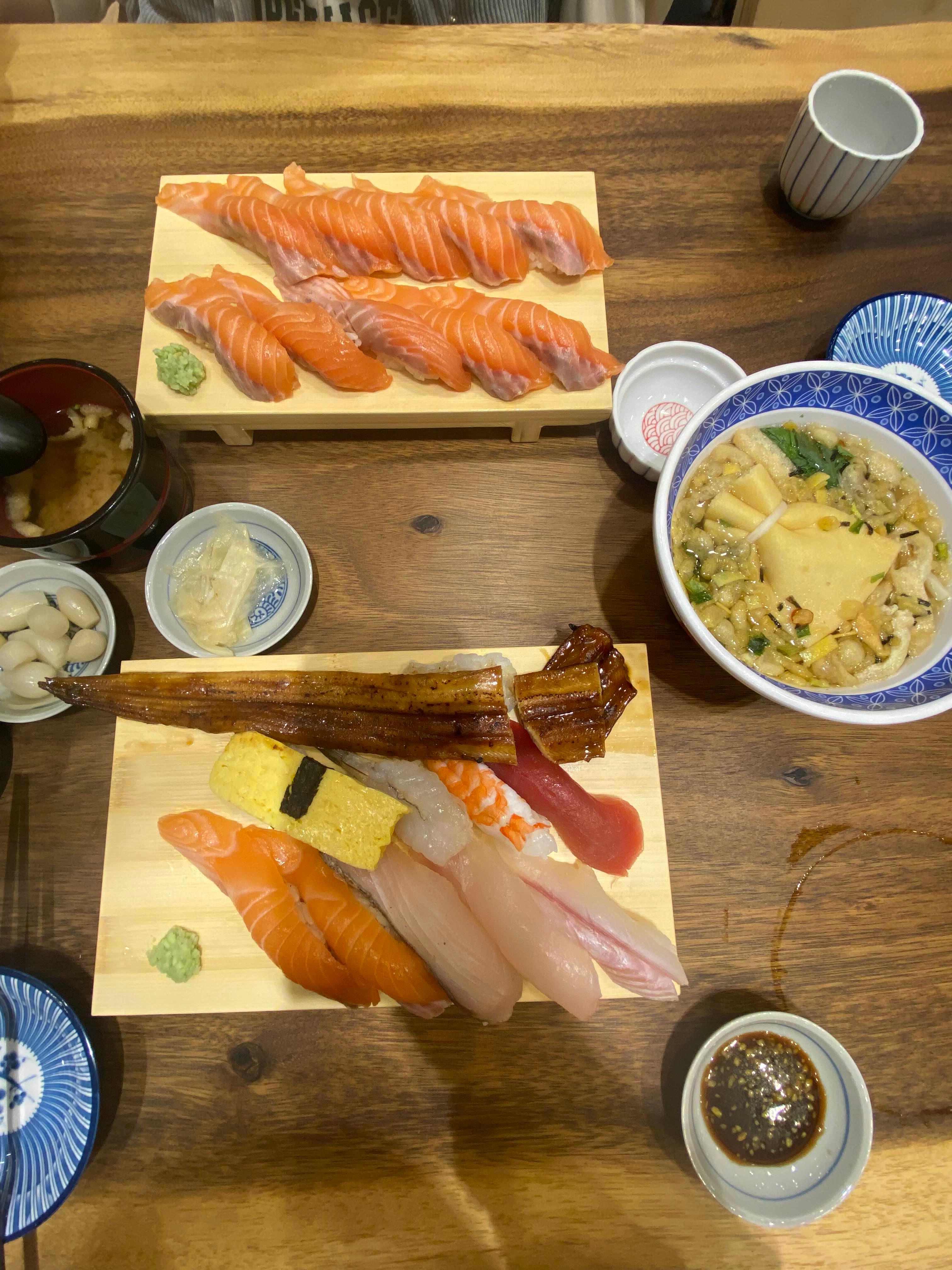 연어초밥과 우동을 맛있게 먹었고, 오늘의 초밥은 종류가 많았으나,